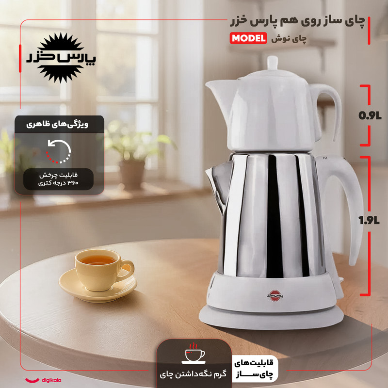 چایساز رویهمی پارس خزر مدل چای نوش یک دستگاه خوشساخت و کارآمد برای تهیه انواع چای و دمنوش است که با طراحی کلاسیک و عملکرد بهینه، جایگاه ویژهای در آشپزخانههای خانگی پیدا کرده است. این مدل از نوع روهمی بوده و با قرار گرفتن قوری بر روی کتری، فرآیند دمآوری به شیوه سنتی و حفظ عطر و طعم نوشیدنی را تضمین میکند. بدنه کتری از استیل ضدزنگ براق و مقاوم ساخته شده که دوام بالا، مقاومت در برابر خوردگی و انتقال مؤثر گرما را فراهم میآورد. قوری این چایساز از جنس چینی لعابدار است که علاوه بر ظاهر زیبا، در حفظ حرارت و طعم طبیعی چای عملکرد عالی دارد. ظرفیت کتری ۱.۹ لیتر و ظرفیت قوری ۰.۹ لیتر انتخابی متناسب برای خانوادههای متوسط و پذیرایی از مهمانان به شمار میرود. این مدل با توان مصرفی ۱۶۵۰ وات و رده مصرف انرژی کم (به لطف ترموستات داخلی)، امکان جوشآوری سریع آب و حفظ دما برای دمکشیدن ملایم را فراهم میکند. سیستم نگهداشتن دما بهطور اتوماتیک پس از جوش، آب را در حالت ملایم نگاه میدارد تا چای بهصورت کامل دم بکشد. نحوه کنترل دستگاه دکمهای ساده و قابلفهم بوده و وضعیت عملکرد از طریق چراغهای نشانگر جوش، گرمنگهدار و آمادهبهکار نمایش داده میشود. ویژگی ایمنی سیستم قطع خودکار نهتنها هنگام اتمام آب فعال میشود بلکه در شرایط اضطراری از آسیب به المنت و بدنه جلوگیری میکند. طول سیم برق ۹۰ سانتیمتر با قابلیت چرخش ۳۶۰ درجه کتری روی پایه، جابجایی و استفاده را آسانتر میسازد. وزن دستگاه ۲.۷ کیلوگرم و ابعاد آن ۲۰x۲۰x۳۷ سانتیمتر است که فضای کمی اشغال کرده و برای آشپزخانههای کوچک هم مناسب است. از نظر قابلیتها، چای نوش دارای در جداشونده کتری و اجزای قابل شستوشو در ماشین ظرفشویی شامل قوری، در کتری و در قوری است که نظافت آن را بسیار آسان میسازد. برنامههای پیشفرض این مدل مبتنی بر تهیه چای سنتی و دمنوشها طراحی شده تا کاربر بدون تنظیمات پیچیده، نتیجه مطلوبی دریافت کند. در مجموع، پارس خزر چای نوش ترکیبی از طراحی سنتی، مصرف بهینه انرژی، ایمنی بالا و سهولت نظافت است و برای کسانی که به طعم اصیل چای و دمنوش اهمیت میدهند، انتخابی مطمئن و بادوام خواهد بود.