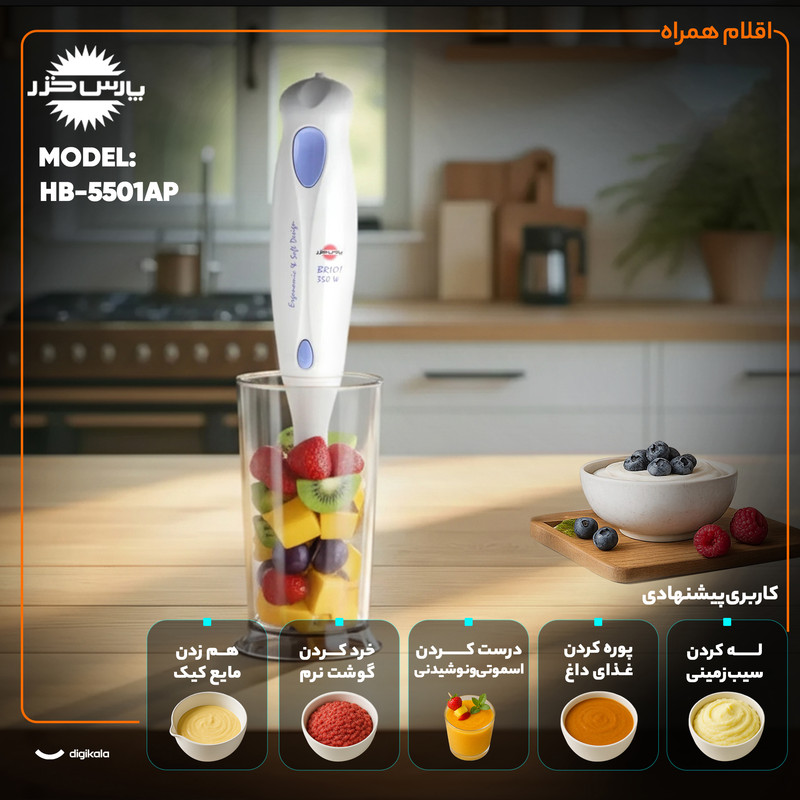 گوشتکوب برقی پارسخزر مدل HB-5501AP یک ابزار کارآمد و چندکاره برای آشپزخانههای مدرن است که با طراحی و ویژگیهای منحصربهفرد، به شما در آمادهسازی انواع غذاها کمک میکند. بدنه دستگاه از پلاستیک مقاوم ساخته شده و میله آن هم از جنس پلاستیک است. این دستگاه با توان ۳۵۰ وات و سرعت ثابت، توانایی پوره کردن غذاهای نیمهآماده و خردکردن غذاهای پخته را بهطور مؤثر دارد. تیغههای دو پره از جنس استیل ضدزنگ و محور تمام استیل آن، به کیفیت برش و دوام دستگاه افزوده و عملکرد بهینه ارائه میدهد. این گوشتکوب برقی بهراحتی با قابلیت جداشدن تیغهها، نگهداری و شستوشوی آسانتری را فراهم میکند. طراحی آن بهگونهای است که میتواند بر روی دیوار نصب شود و بدین ترتیب از فضای آشپزخانه بهخوبی بهرهبرداری کند. همراه با دستگاه، یک لیوان با حجم ۰.۷ لیتر هم ارائه میشود که برای استفادههای مختلف در آمادهسازی غذا مناسب و بهراحتی قابلشستوشو در ماشین ظرفشویی است. با این ویژگیها و امکانات، گوشتکوب برقی پارسخزر مدل HB-5501AP انتخابی مناسب برای تسهیل فرایندهای آمادهسازی غذا در خانه است.