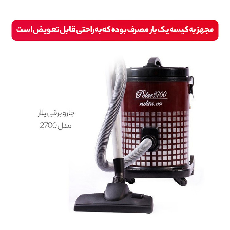 جاروبرقی سطلی پلار مدل 2700 با 1600 وات توان و رده انرژی A یکی از بهترین گزینه ها برای مصرف خانگی می باشد. این جاروبرقی سطلی از فن آوری فیلتراسیون 4 مرحله ای استفاده می کند. این جارو برقی سطلی مجهز به کیسه یک بار مصرف بوده که به راحتی قابل تعویض است. هم چنین شما میتوانید از کیسه های دائمی که روی خود محصول هستند استفاده کنید. این کیسه ها نیاز به تعویض ندارند و شما باید بعد از پر شدن دو سوم کیسه آن را خالی کرده و مجددا در داخل دستگاه قرار دهید.