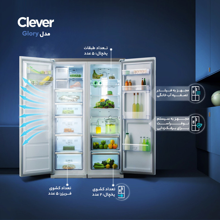 طراحی داخلی گسترده با امکان جداسازی مواد غذایی، از قابلیتهایی است که به خوبی در یخچال و فریزر دو قلو مدل Glory کلور دیده میشود. تعداد پنج طبقه و دو کشو در یخچال و پنج عدد کشو در فریزر با عمق و ابعاد مناسب، دست کاربر را برای گنجاندن خوراکیهای مورد علاقه باز گذاشته است. موتور اینورتر کم مصرف با کارکردی مناسب با هر شرایط آب و هوایی نه تنها مصرف انرژی این محصول را پایین نگه داشته بلکه به طول عمر بالای آن کمک میکند. سیستم برفک زدایی به منظور رهایی از پر چالشترین مشکل یخچالهای قدیمی، از ویژگیهایی است که نباید به آسانی از کنار آن گذشت. یخساز اتوماتیک و آبسردکن مجهز به فیلتر تصفیه خانگی شرایط استفاده از این مدل را آسان کردهاست. گردش هوای خودکار و تنظیم دمای داخلی به صورت هوشمند، کارکرد هرچه بهتر در این مدل را ارائه میکند. دو نمایشگر مجزا لمسی، مدیریت و کنترل گلوری کلور را بر عهده دارد. در بخش طراحی دستگیرههای سراسری که گسترش عمیاتی بالایی را به ارمغان میآورد جلوه بصری خاصی به محصول بخشیده است.